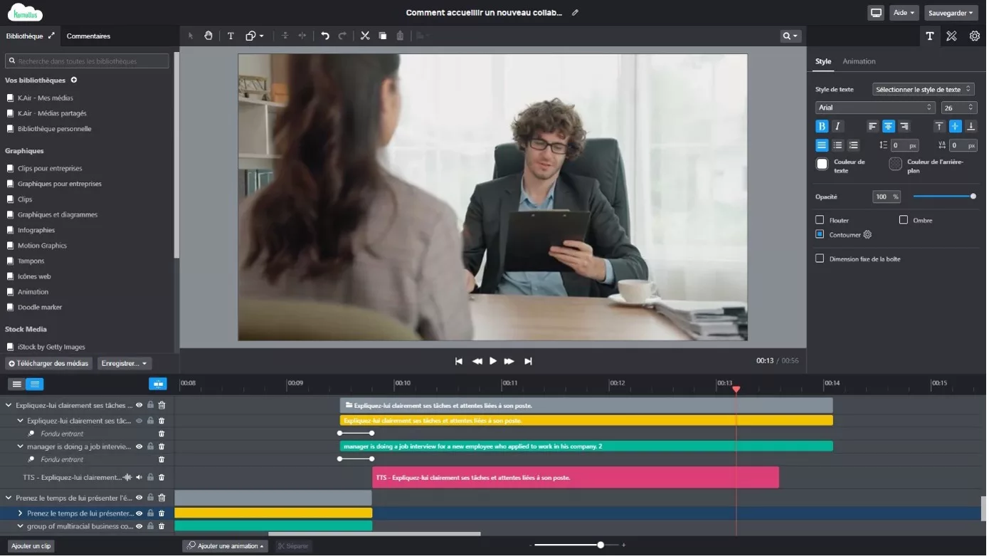 To create K.Movie, we’ve compiled all the best features of the leading video editing software such as iMovie, Adobe Premiere or DaVinci Resolve. Accessible online directly from K.Air, it offers the possibility of adding an infinite number of audio video tracks, video tracks, animation and transition effects, and is packed with hundreds of premium features. And all in an intuitive, easy-to-use tool, so you can concentrate on your core business.