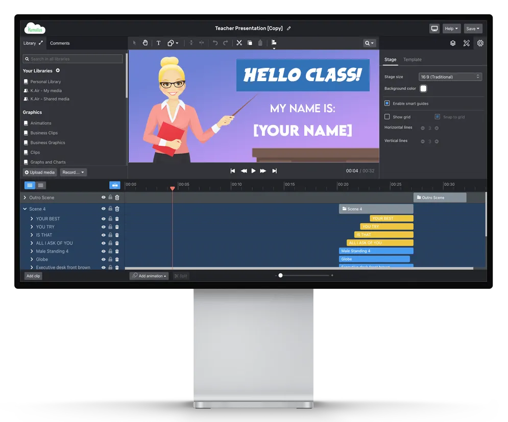 Create cartoon-style videos, whiteboard presentations with hands, drawing and writing, onboarding videos, tutorials, videos based on documentary sequences, animated graphics, etc. Running out of ideas? Choose from our hundreds of thematic templates, use AI to generate a new video from text, or turn your Powerpoint presentations directly into videos!