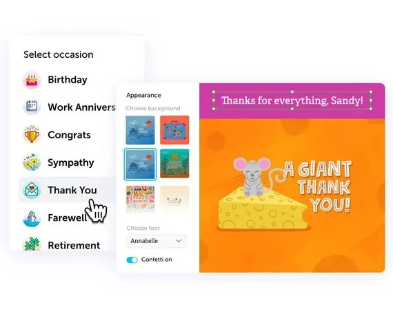 Empower teams to recognize each other with online group cards. Create personalized eCards for birthdays, work anniversaries, farewells and more.