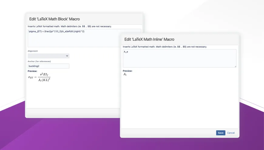 With LaTex Math you can intuitively add mathematical equations, expressions, units, and representations of complex formulas to your Confluence pages, and they will be rendered correctly. LaTex Math macro editor will preview both inline and block equations, making page editing easier. LaTeX Math includes 5 macros that allow users to: