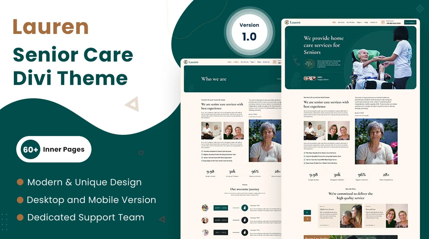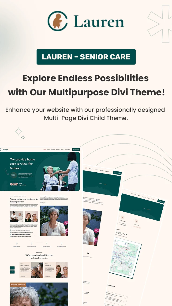 Lauren is a warm and professional Divi child theme designed for senior care centers, nursing homes, and elderly support services. It features a multipurpose, multi-page layout built with Divi modules, ensuring easy customization. With a prebuilt global header and footer, your website will have a consistent and polished look. The theme includes sections for services, caregiver profiles, testimonials, and contact details, helping you connect with families and individuals seeking compassionate senior care. Lauren provides a user-friendly and visually appealing solution to showcase your services and build trust with your audience.