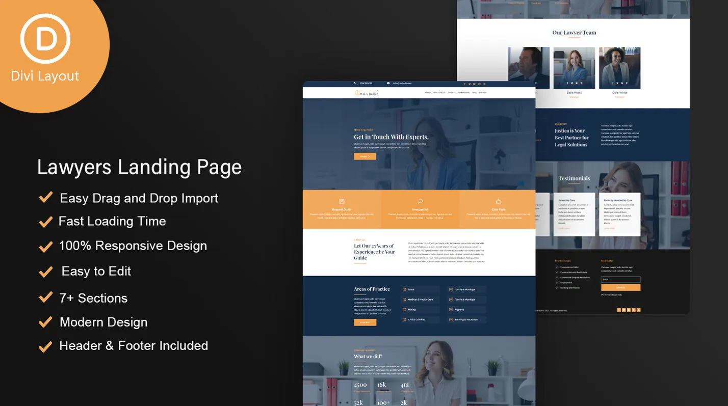 Elegant Divi layout for law firms with 7 premade pages, gold accents, and trust-building design elements.