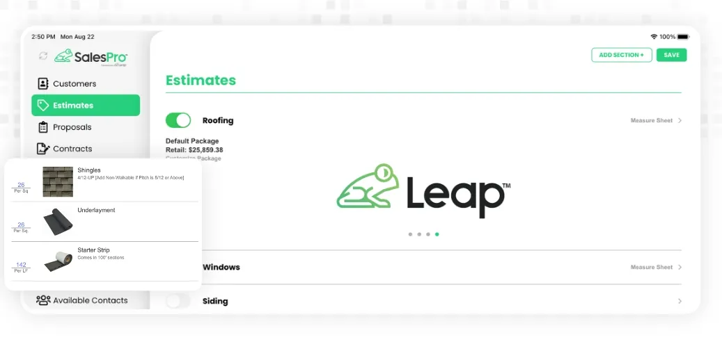Leap™ SalesPro is a patented sales automation platform designed for contractors in industries like roofing, remodeling, HVAC, and general construction. It enables sales teams to build accurate estimates, dynamic contracts, and professional proposals in seconds. With built-in financing, payment processing, offline functionality, and CRM integrations, Leap SalesPro streamlines the entire in-home sales process—from pitch to payment. Leap SalesPro empowers contractors to win more jobs by offering flexible pricing tiers, real-time contract generation, and universal credit applications. Whether you're a small business or an enterprise, Leap SalesPro helps scale your sales operations with precision and speed.