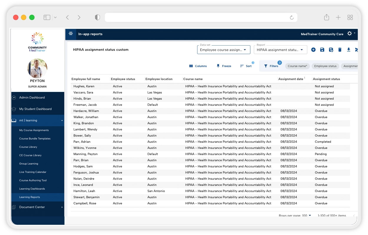 MedTrainer Learning is a software platform designed to manage training and education within healthcare organizations. It provides a centralized environment for delivering required courses, assigning training based on roles, and tracking completion to support regulatory and organizational requirements. The system is structured to handle compliance‑driven education such as safety, privacy, clinical, and operational training. It supports standardized content delivery while allowing organizations to manage training assignments across different departments, job roles, and locations. MedTrainer Learning is intended to reduce manual training administration and improve visibility into staff training status. It serves as a documented system of record for completed education and ongoing training obligations within healthcare environments.
