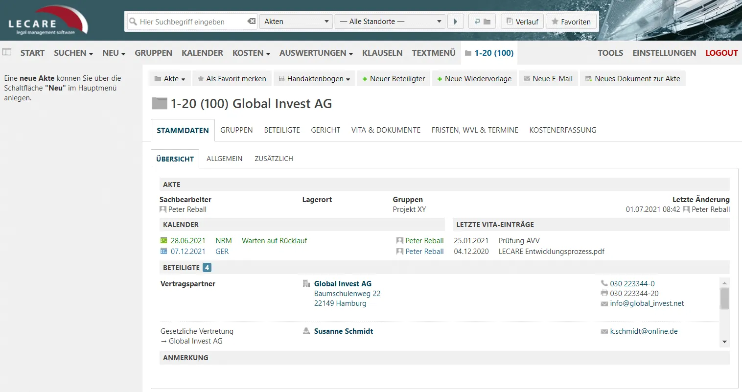 LECARE is a modular legal management software designed for corporate legal departments. It centralizes and streamlines legal operations including contract management, document handling, compliance, and collaboration with internal and external stakeholders. LECARE supports both on-premise and cloud-based deployment and integrates seamlessly with Microsoft Office and other enterprise systems. Its browser-based interface ensures accessibility and usability across locations and teams.