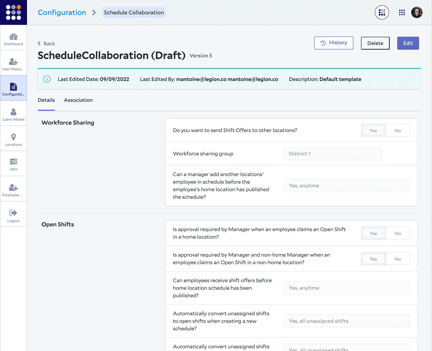 Legion WFM's Self-Service Control Center provides powerful, self-service capabilities through an intuitive user interface, simplifying administration and operational management for workforce management. It allows administrators to quickly and easily establish centralized configurations, with lightning-fast implementations facilitated by easy-to-use configuration templates and sample data. The system dynamically updates location and employee groups without manual intervention, and reduces compliance burdens through automated configurations and updates that adapt to labor law changes. The intuitive UI offers an end-user-like experience, eliminating the need for complex scripts and spreadsheets for configuration settings. This solution is designed to reduce administrative burdens and enable efficient workforce management.