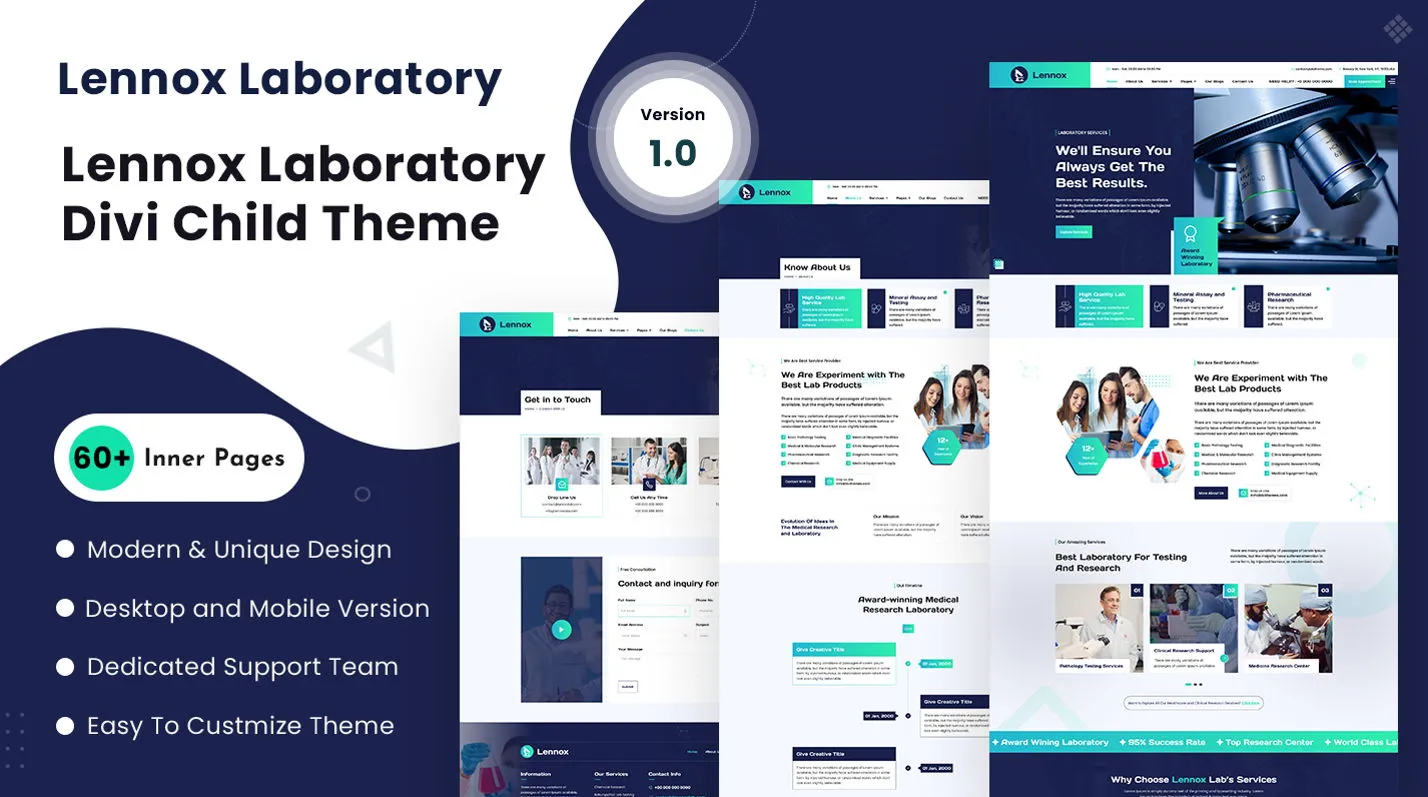 Lennox Laboratory is a clean and professional Divi child theme designed for laboratories, research centers, and scientific services. It features a multi-purpose and multi-page layout, making it easy to create an informative and functional website. Built entirely with Divi modules, this theme offers simple customization without the need for coding. It includes a prebuilt global header and footer, ensuring a consistent design across all pages. With its responsive layout, this theme helps you effectively showcase your services, research, and laboratory capabilities to potential clients and partners.