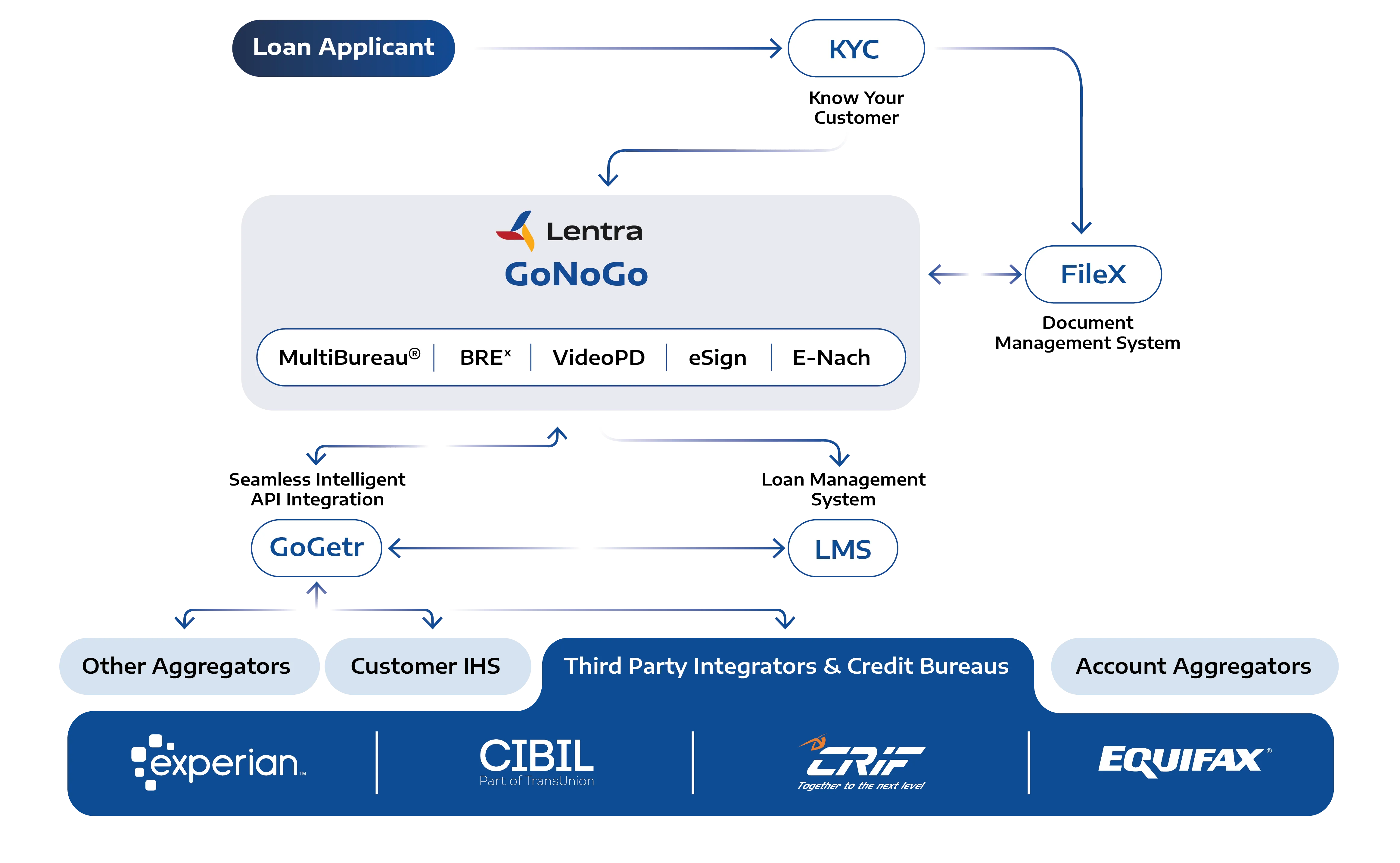 - API integrations : to obtain KYC, Bureau, Fraud, Financial and Social Data information of the applicants in real-time