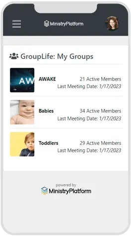 Give your group leaders a fully responsive and integrated app, allowing them to see, manage, and engage with their Groups (or Classes, Teams, Life Groups, etc.). They’ll be able to see their group members, schedule meetings, take attendance, manage volunteers, send messages, and more.
