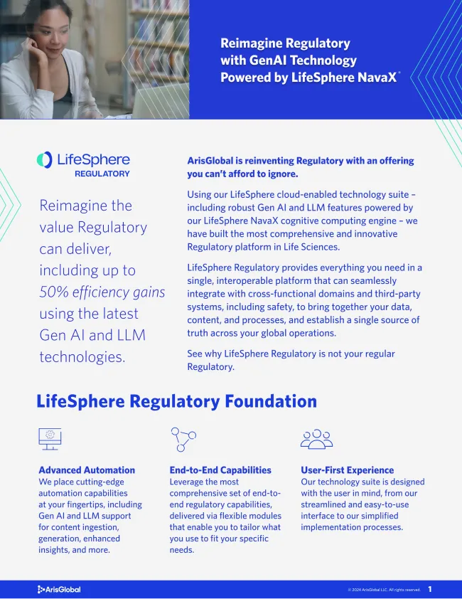 LifeSphere Regulatory goes beyond legacy systems by seamlessly bringing together your data, content, processes and embedding the latest technologies across the end-to-end Regulatory lifecycle, including Gen AI and LLM features powered by LifeSphere NavaX.