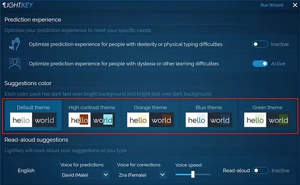 - Offers visual themes optimized for all common types of color blindness, improving text prediction visibility.