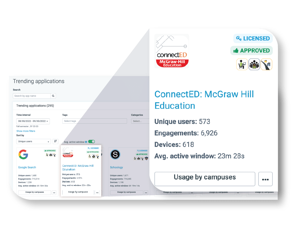 - Granular Reporting: Allows drilling down into details of individual apps, software, or online resources to show usage by students, classes, groups, or schools.