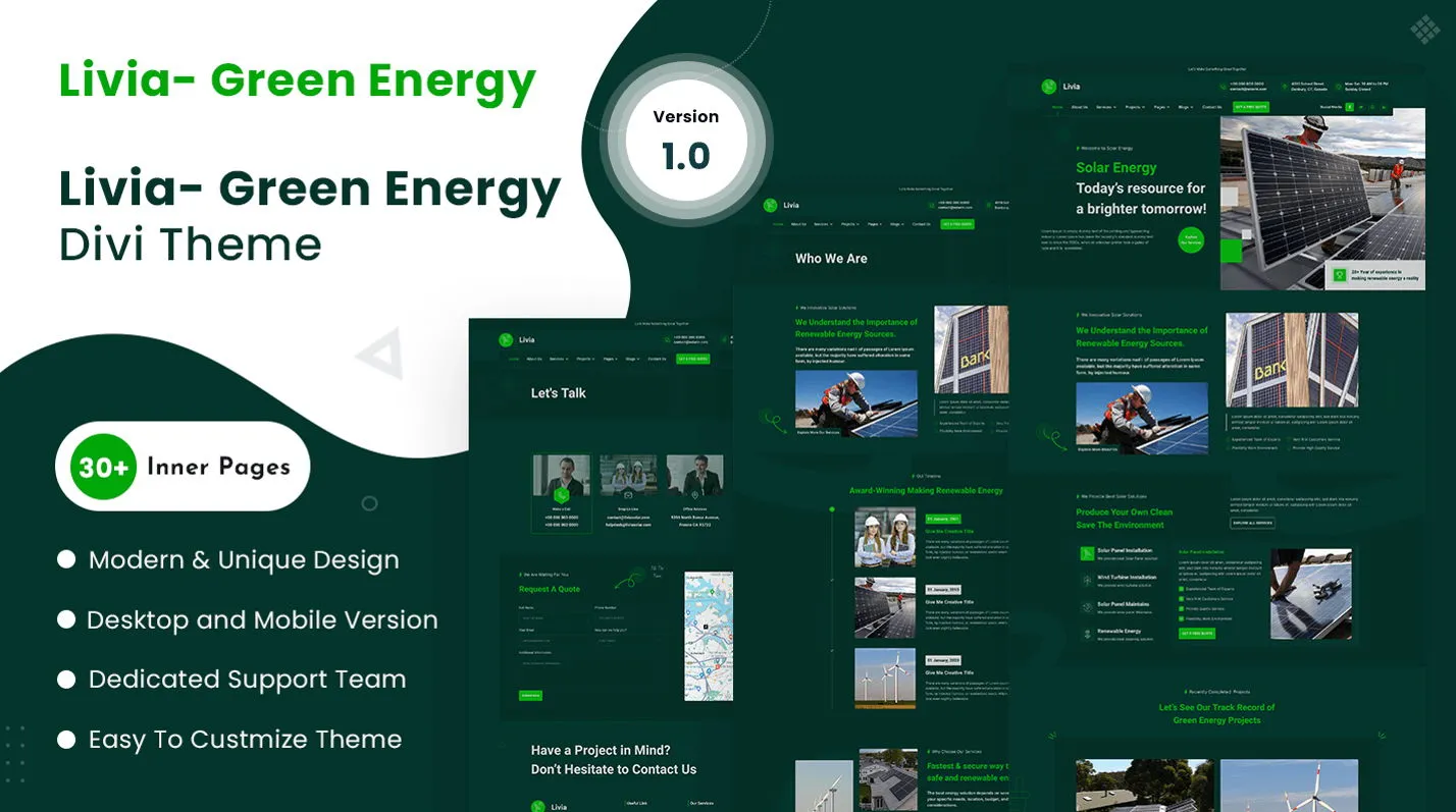 Livia Green Energy is a modern and eco-conscious Divi child theme designed for businesses in the green energy, renewable energy, and sustainability sectors. It features a multi-purpose and multi-page layout that allows you to build a professional website with ease. The theme is built entirely with Divi modules, making it simple to customize without coding. With a prebuilt global header and footer, your website will have a consistent, polished look across all pages. The responsive design ensures that your site looks great on all devices, helping you effectively promote your green energy solutions and services.