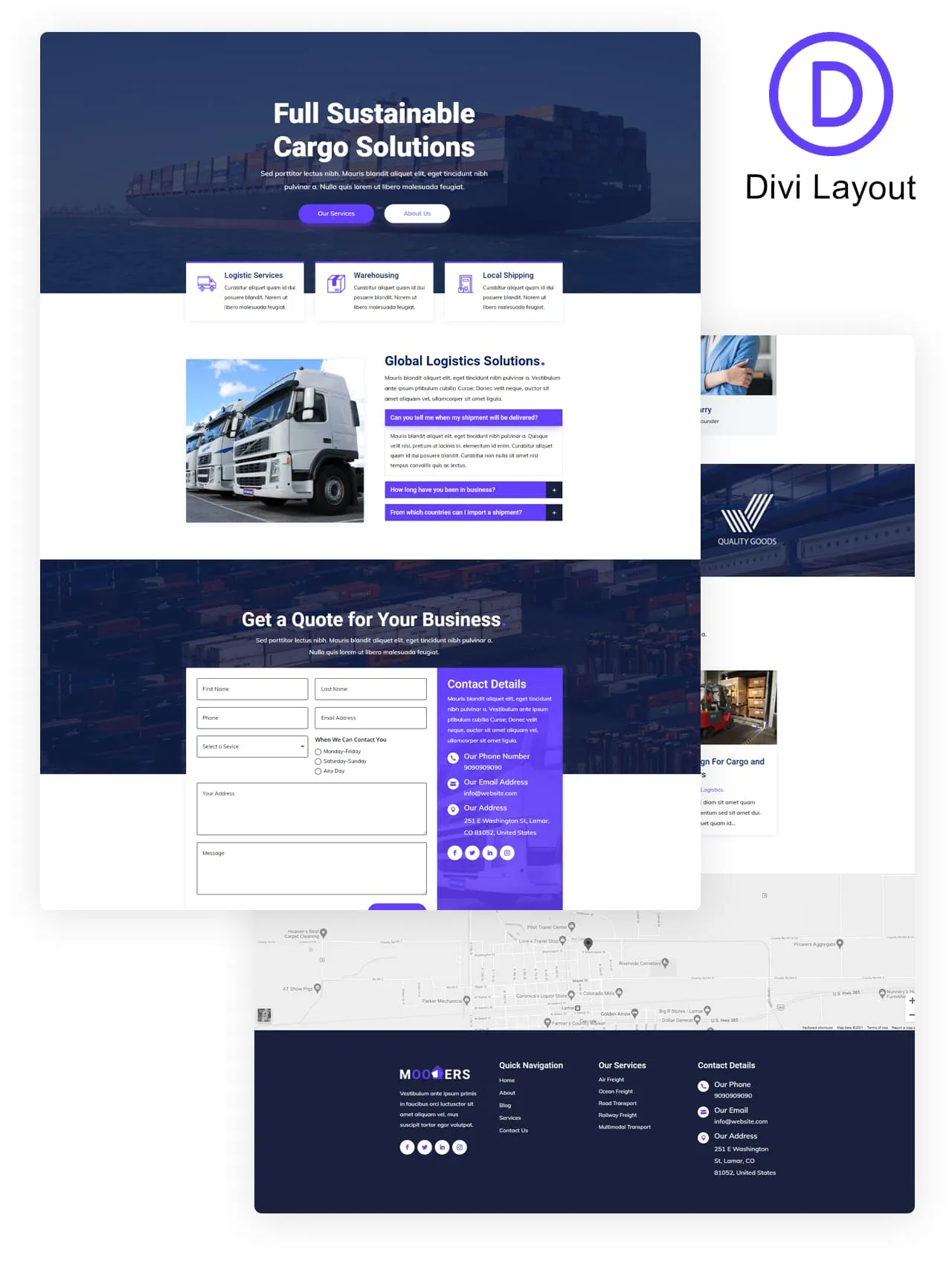 Professional logistics layout for Divi with service sections, contact forms, and responsive design for transport businesses.