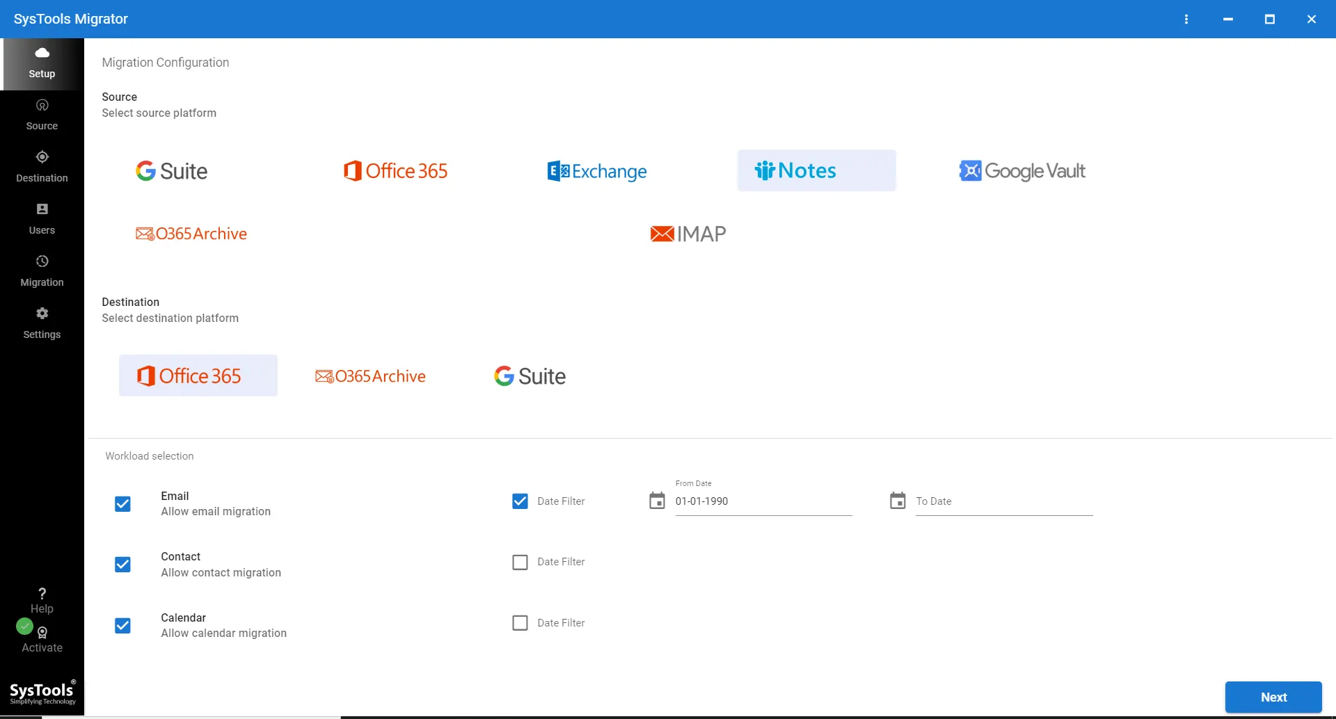 Migrate Lotus Notes (NSF) data to Office 365 mailboxes, preserving data integrity, with options for selective migration, filtering, and advanced settings.