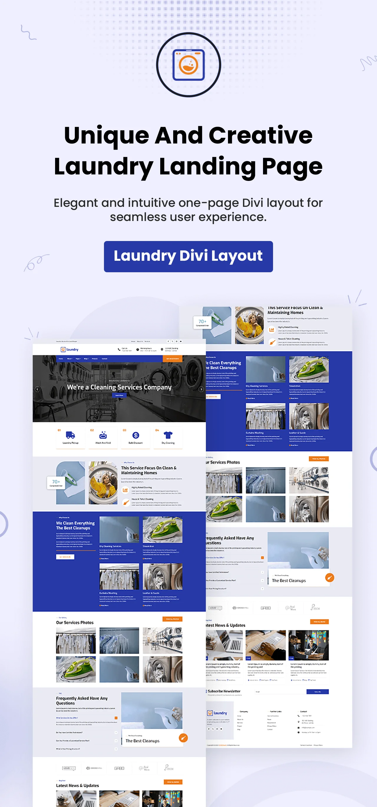 Divi layout for laundry and dry cleaning businesses with clean design, responsive sections, and one-page simplicity.