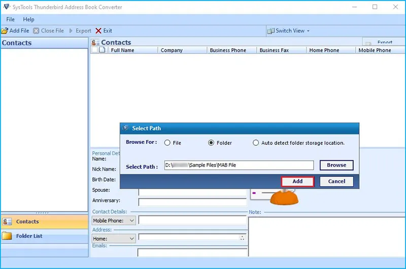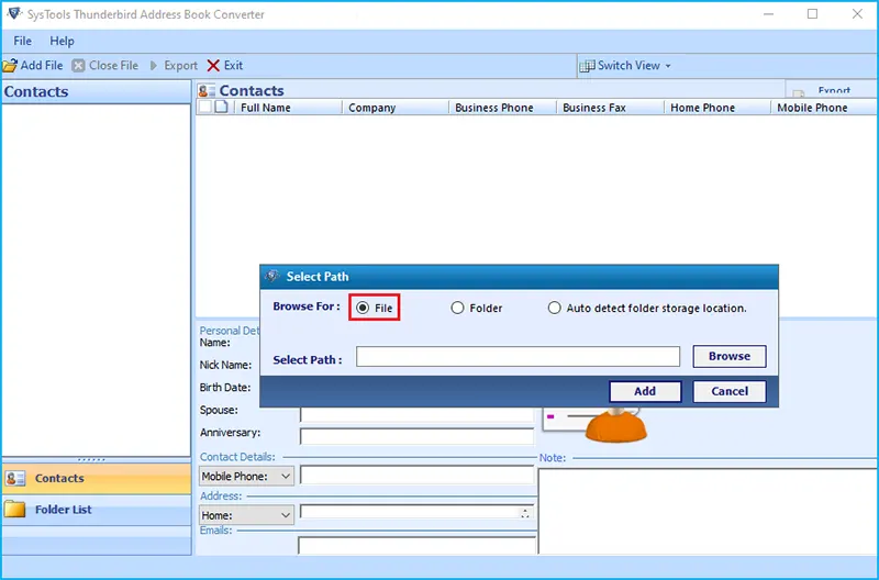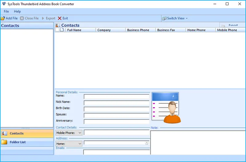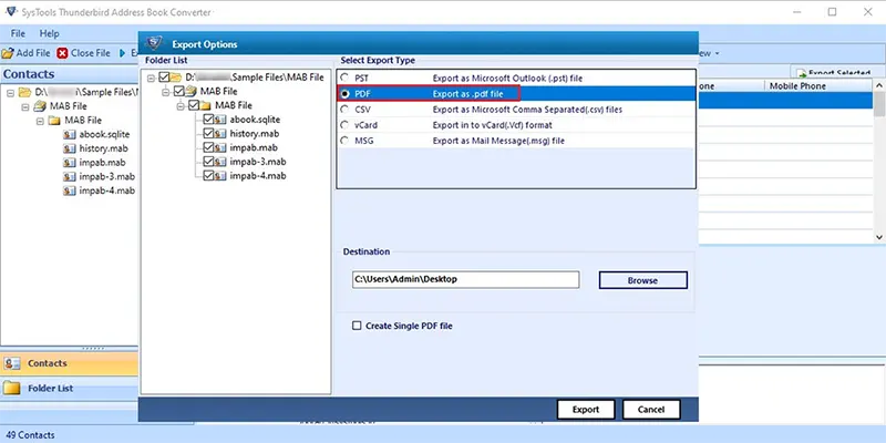 Convert Mozilla Thunderbird address book data (MAB files) to various formats like CSV, VCF, PST, MSG, and PDF, facilitating data migration and accessibility.