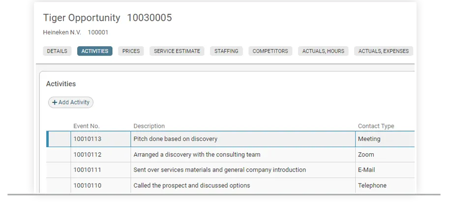 - Track Activities - Business development team members can easily identify relevant efforts taken for each opportunity - Assign activities to team members to establish accountability - Create a template by opportunity type to identify required activities and ensure greater likelihood of success