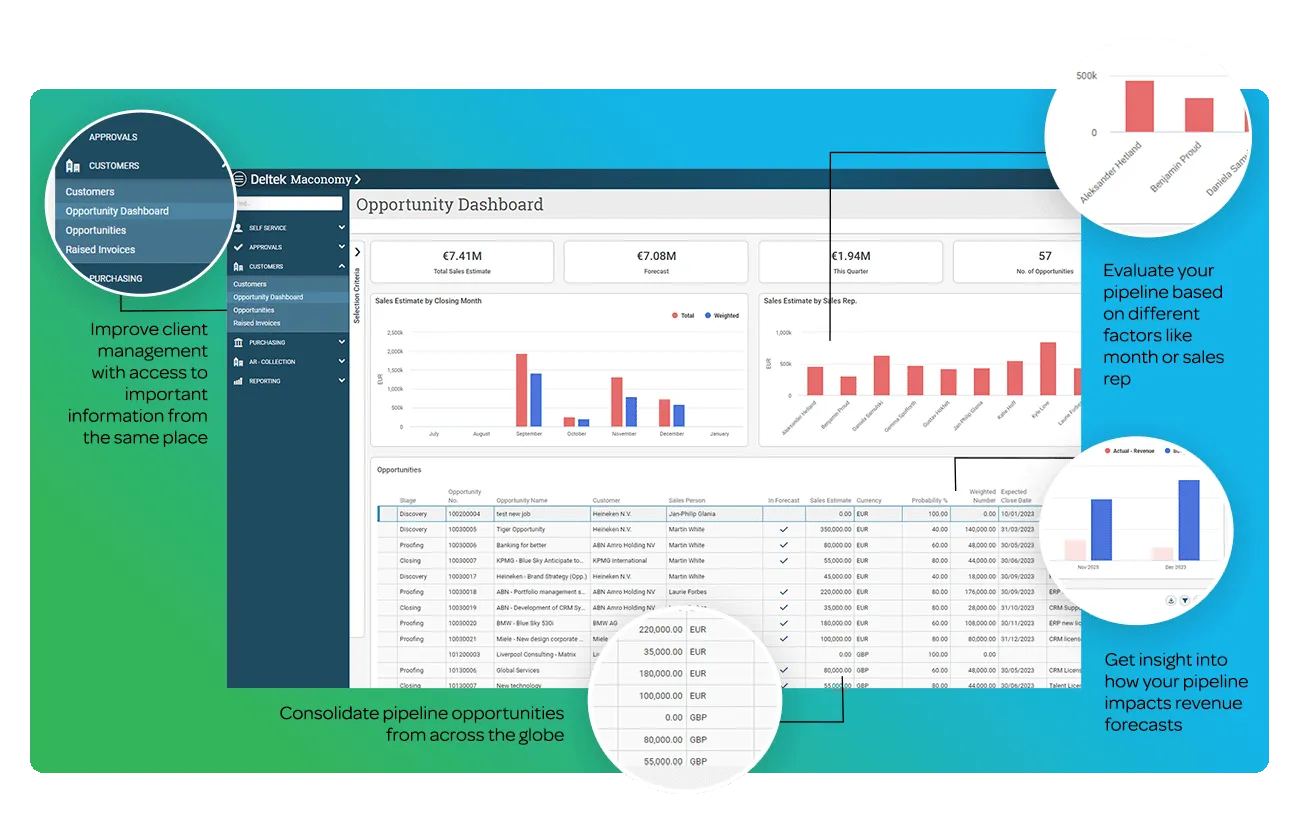 Deltek Maconomy provides foundational CRM capabilities to enhance your enterprise ERP solution and enable you to manage every relationship between your firm and its customers around the world. By streamlining sales and marketing in a single cloud-based solution, you gain valuable transparency into incoming work and its impact on revenue. And with visibility into past work and current projects, you can evaluate client profitability and nurture the right relationships to support a healthy pipeline.