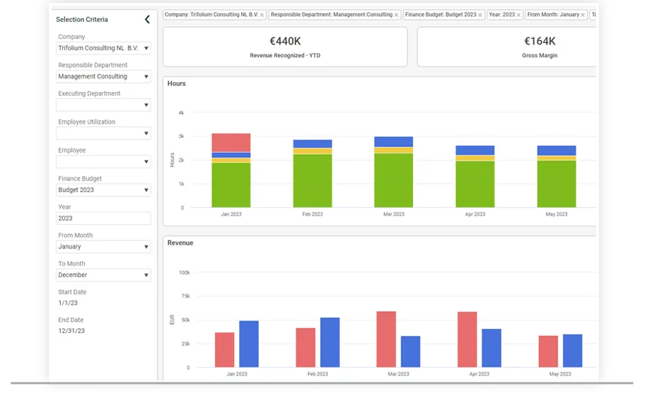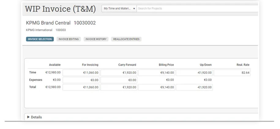 - Drill Down & Customize - Drill down from division or unit to individual project or work stream and control access for multiple user types - Efficient and automated revenue recognition, configurable at cost or selling price - Flexible to support centralized or decentralized invoice processes and hourly, fixed fee or progress billing - Distinct Support for Services Enterprise - Multi-company model enables you to budget for several independent units in multiple locations within compliance - Multi-company roll up for consolidated visibility and reporting - Built to support specific needs of professional services firms like project accounting, WIP and revenue recognition