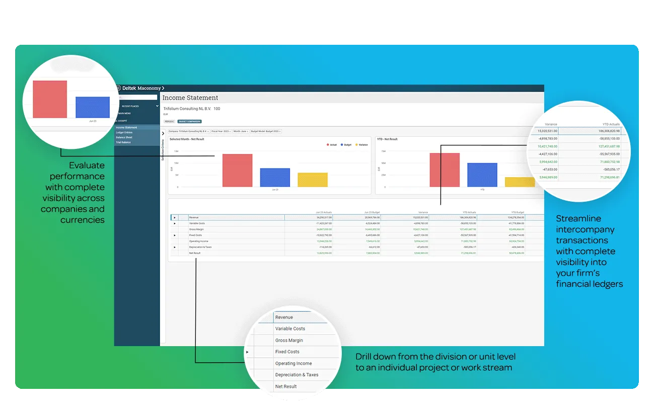 Deltek Maconomy’s Financial Budgeting module provides complete visibility into your organization’s financial ledgers, across companies and currencies. With the ability to drill down from the division or unit level to an individual project or work stream, you can streamline intercompany transactions and accounting processes in one cloud-based solution to improve cash flow, working capital and overall performance.