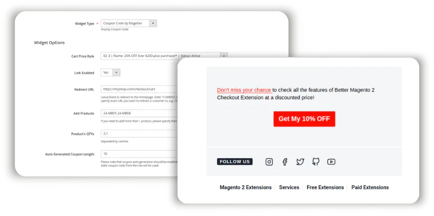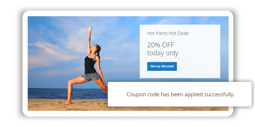 The simpler it is to get a discount, the more customers want it. Don’t complicate the process. Include coupon code links or widgets in your emails to make them convert better. Let your subscribers hit the “Get My Discount” button and apply a discount instantly with no extra steps. The Magento 2 Coupon Code Link Extension makes your email marketing campaigns better.