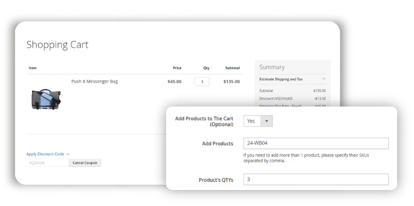 The easier it is to buy from you, the more likely people are to make a purchase. But it’s your task to make it so. Eliminate any unnecessary steps during customers' journey. Add products to the cart automatically upon coupon application. Just specify what products and how many of them to add to the cart. The Magento 2 Coupon Code Extension will handle the rest.