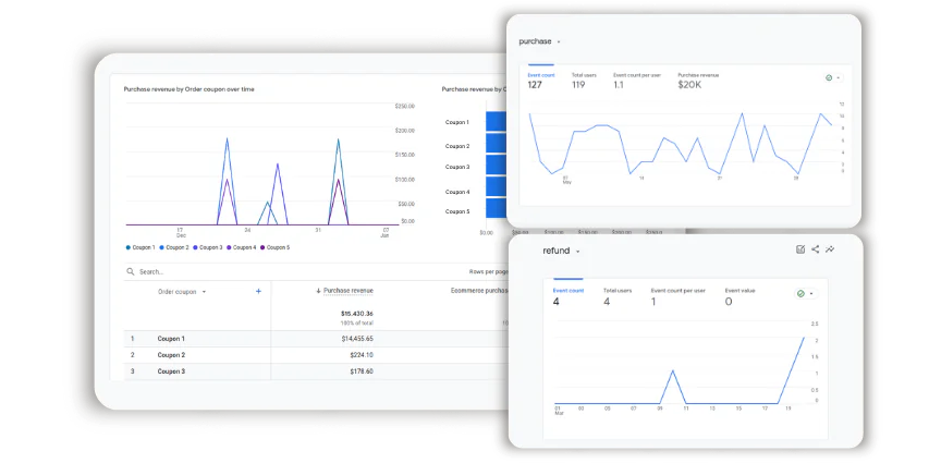 To determine which sales and marketing strategies work the best you need to track conversions and refunds. This Google Tag Manager allows you to monitor all orders in your store 一 made on the frontend or through the admin panel 一 along with the refunds. You can also monitor coupon performance by source and medium. Learn how much revenue each coupon is generating and the total revenue per coupon with the Magento 2 GTM extension.
