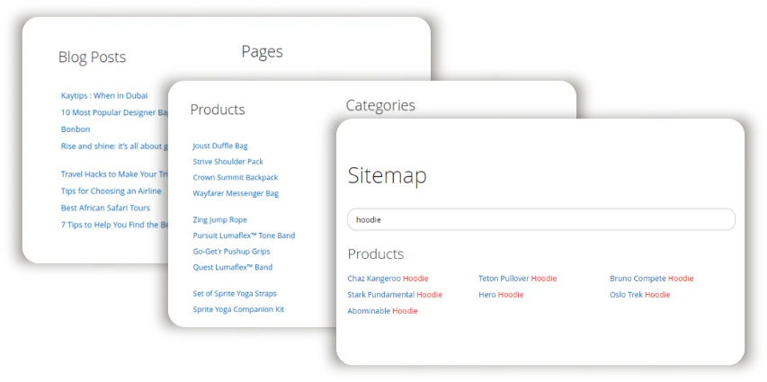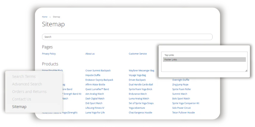 - Add product, category, CMS page and blog links to the HTML sitemap