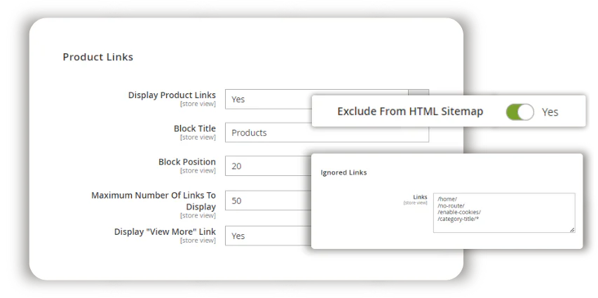 The most effective HTML sitemap loads fast and includes only relevant links. But definitely not all of them. That's why our Magento HTML Sitemap offers a variety of options: