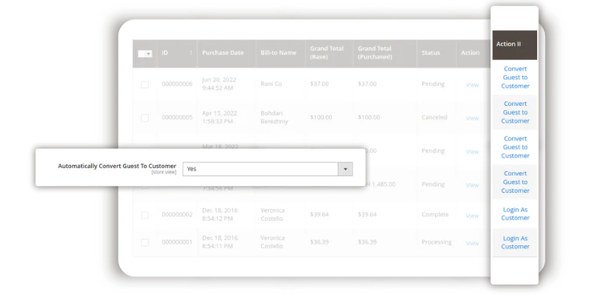 While some customers do place orders as customers, the majority still prefer the guest checkout. That’s what makes things difficult for the managers. Never lose any data about guest orders assigned to the same person. Convert guest orders to customers automatically on checkout or manually from the admin. Deliver exceptional experience by quickly identifying possible issues and fixing them timely.