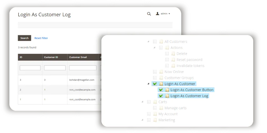Magento 2 Login as Customer Extension is a solution that allows admin users to log in to a customer account in one click. No need for the password of any authentication data. Just one click and your sales managers are already there. Help customers all the way through their journey, fix issues timely and deliver an exceptional experience at zero effort.