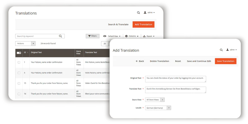 The Magento translation process is never easy, considering the number of elements you need to translate. Besides, there’s always a chance you might miss something. To reduce the localization hassles we’ve gathered all texts available for translation in one place. Find all the texts, phrases and words you can translate in the comprehensive translation dashboard and translate directly there.