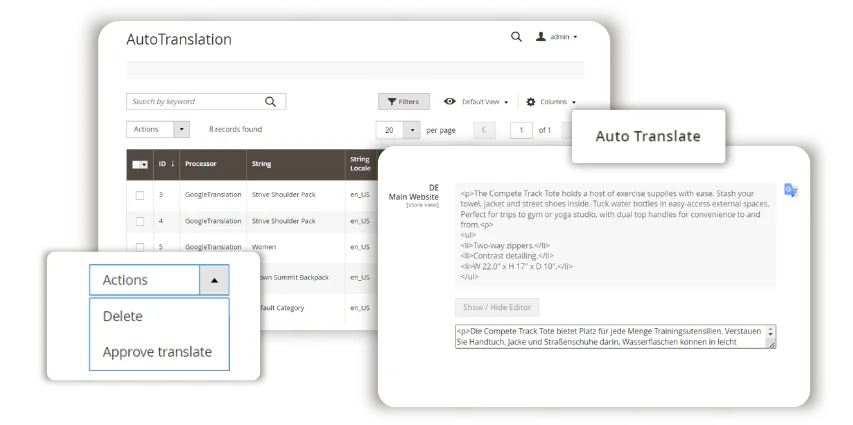 Magento 2 Translation Extension is the translation solution that allows you to localized your Magento 2 store without diving deep into code. Translate buttons, labels, products, categories, emails, and CMS content directly from the admin panel. Find text available for translation automatically and translate them in a popup. Hassle free Magento translation is a few clicks away!