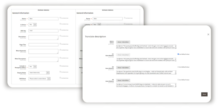 By default, you need to go to each store view separately to edit product and category information or add translations. But not anymore. The Magento 2 Translation module offers you a flyout menu and editing popup. So all you need to translate a certain value now is to hit “Translate”. Add translations, edit separate or multiple product and category attributes for all store views in one go.