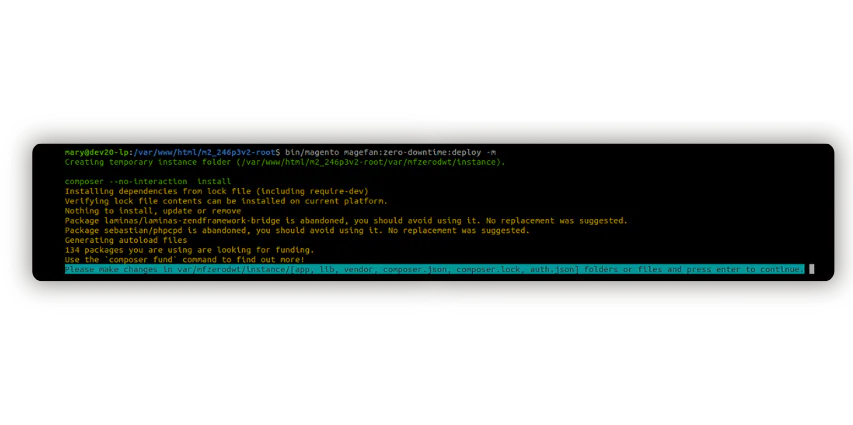 Although Git allows you to deploy changes way easier, sometimes you can’t or don’t want to use it. Can you still reduce downtime to ZERO? Absolutely yes! Magento Zero Downtime Deployment allows you to run one single command for that. Then, you edit, change or delete the files on the created temporary instance and click “Enter” in the console. The extension deploys all changes without downtime.