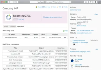 Manage MailChimp subscribers from Redmine CRM contacts and companies.