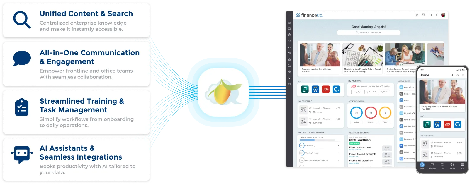 MangoApps is a unified employee experience platform that centralizes communication, collaboration, knowledge, and operations. It combines intranet, internal communications, HR tools, and AI-powered workflows into one mobile-friendly hub, helping organizations improve engagement, streamline processes, and connect every employee across departments and locations.