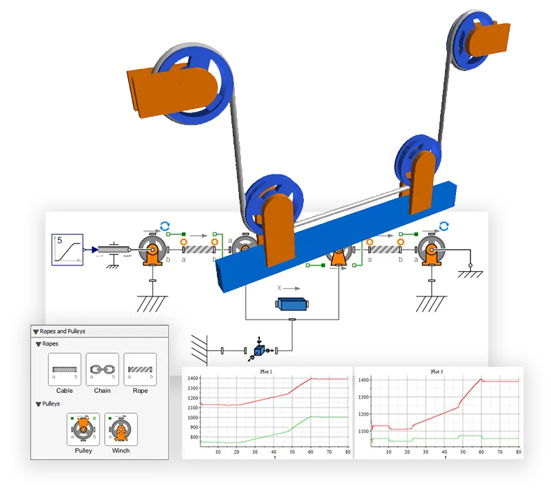 The MapleSim Ropes and Pulleys Library is an add-on for the MapleSim modeling environment. It allows engineers and designers to create, simulate, and analyze the dynamics of systems involving ropes, cables, chains, and pulleys. This tool is used to add realistic fidelity to machine models, enabling the study of mechanical behaviors such as axial rigidity, bending, pulley slippage, and wind forces. The library is especially useful for developing and validating winch and pulley mechanisms in virtual prototypes before physical prototyping, reducing design errors and costs.