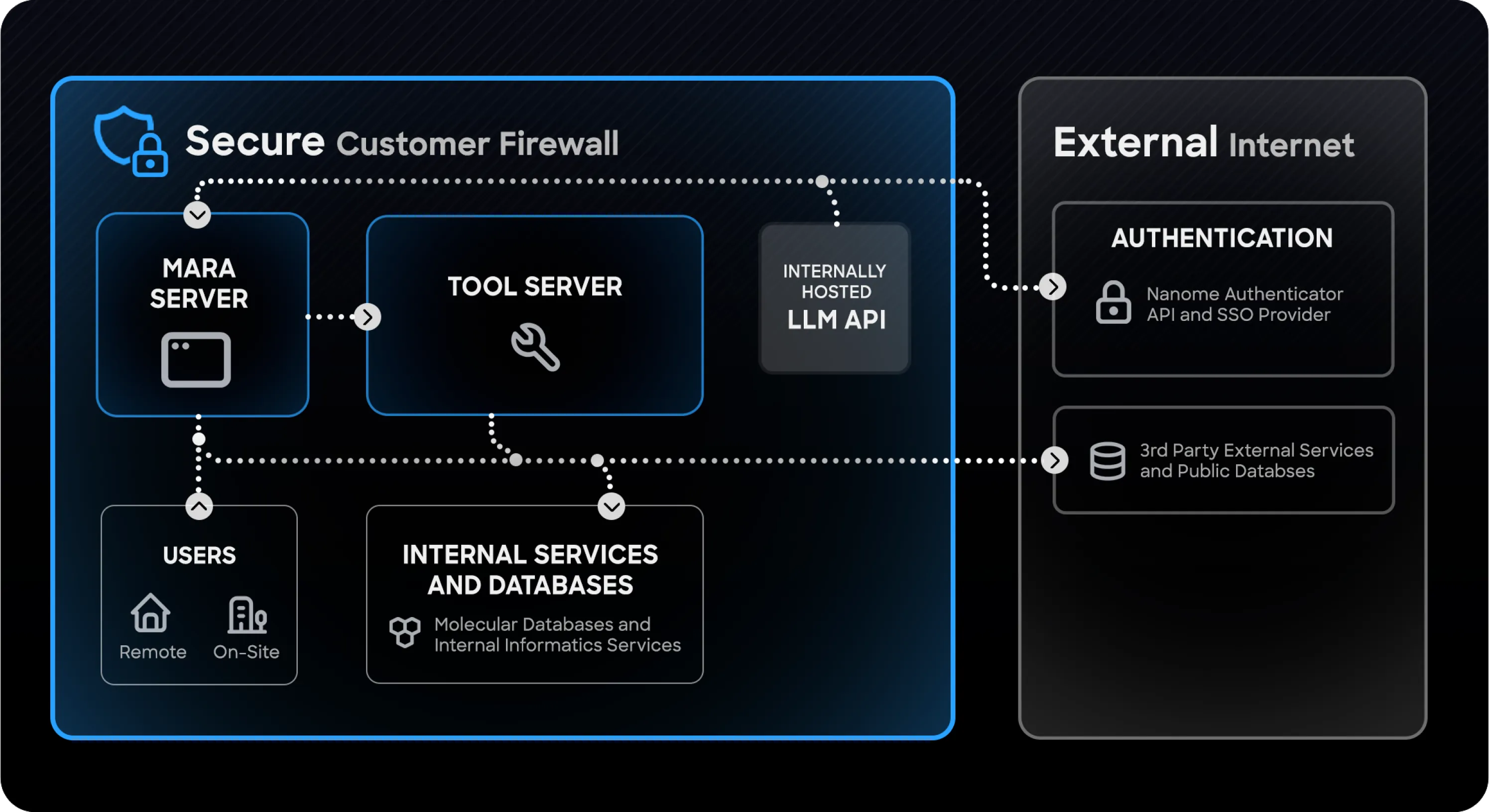 - Operates completely behind your IT firewall, supporting preferred LLMs like LLAMA 3 or privately Azure-hosted GPT4, with SSO-based login and key usage monitoring. Nanome has no access to enterprise data.