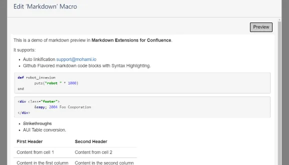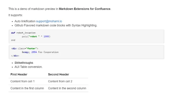 Display markdown in your Confluence pages! Use quick formatting options that make sense. Support for tables, fenced code block with syntax highlighting, strikethrough text, HTML, and more!