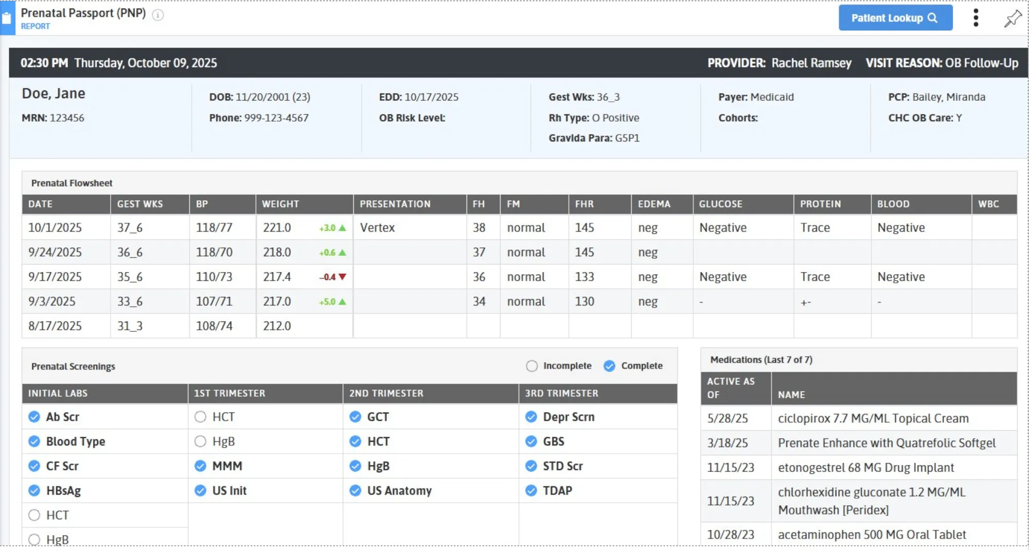 - Flowsheet displaying all prenatal visits with key vitals, procedures, and screenings