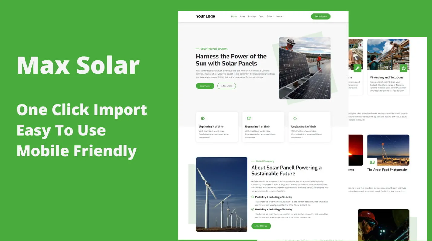 Max Solar is a Divi layout designed for solar energy companies and renewable energy providers. It features clean, modern sections for showcasing services, installations, and contact information. With responsive design and easy customization via Divi Builder, it’s ideal for local businesses looking to promote sustainable energy solutions online.