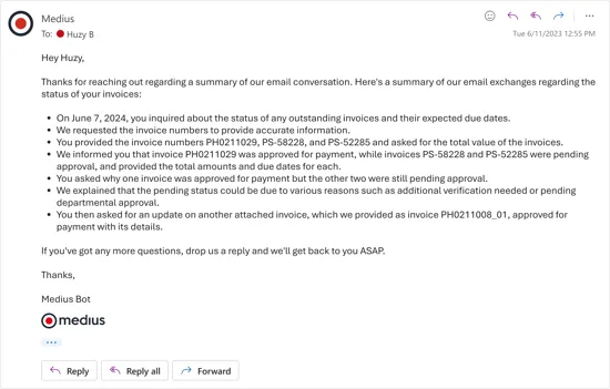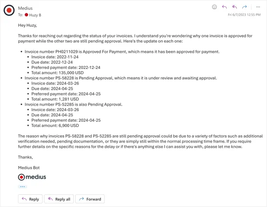 Suppliers want to know when they’ll get paid. You want to know when they’ll stop asking.. Medius Supplier Conversations—our AI assistant for suppliers—answers vendor questions right in their inbox. So they get peace of mind, and you don’t get interrupted.