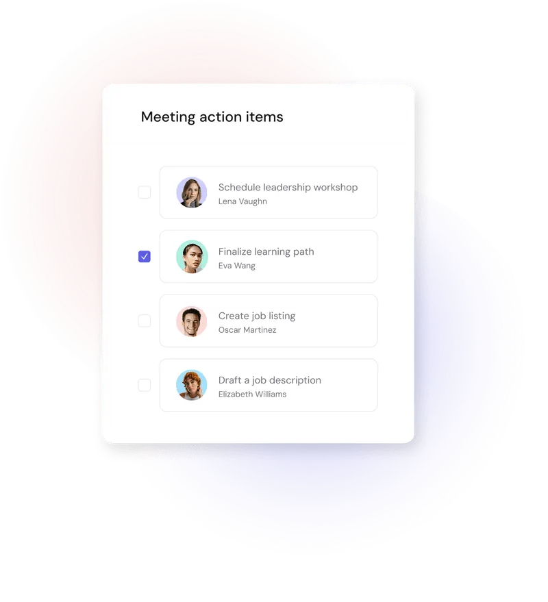 A meeting management module that creates collaborative agendas, AI-generated summaries, and tracked action items to increase alignment and accountability.