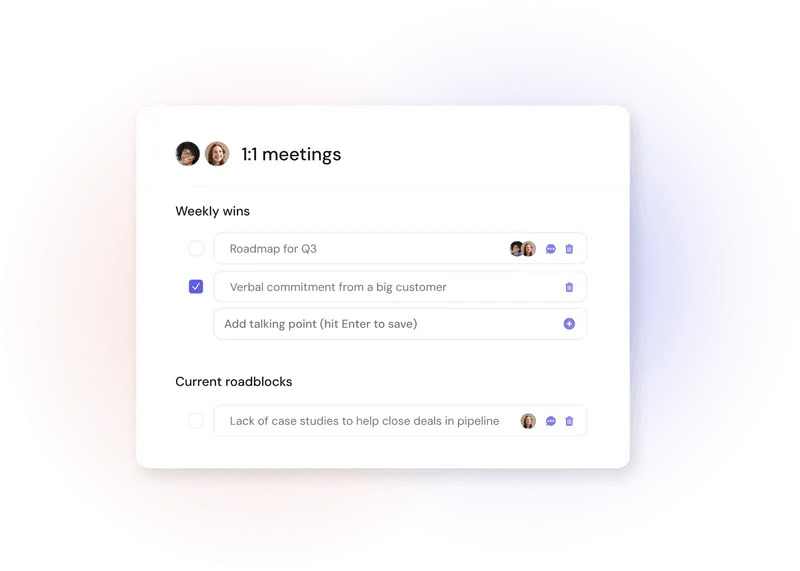 - Goals & Context Linking: Displays OKRs and related goals alongside agendas to surface status and remove roadblocks during meetings.