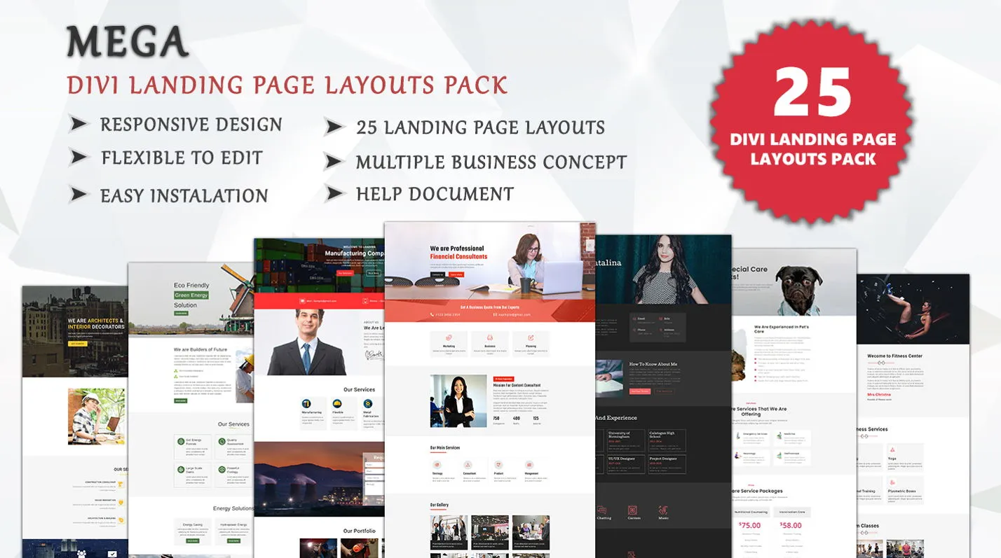Mega layout pack is a great collection of creative and simple Divi landing page layouts. This layouts pack contains 25 layouts which is suitable for corporate, business, agency, consultancy, finance, events, legal, charity, medical, travel, construction, real estate, industry, education, gym and general categories.