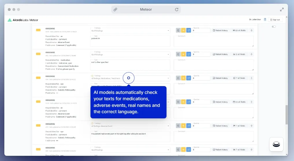 - AI-Supported Text Analysis: Meteor analyzes thousands of free-text entries per study, identifying adverse events, drugs, and treatments with precision.