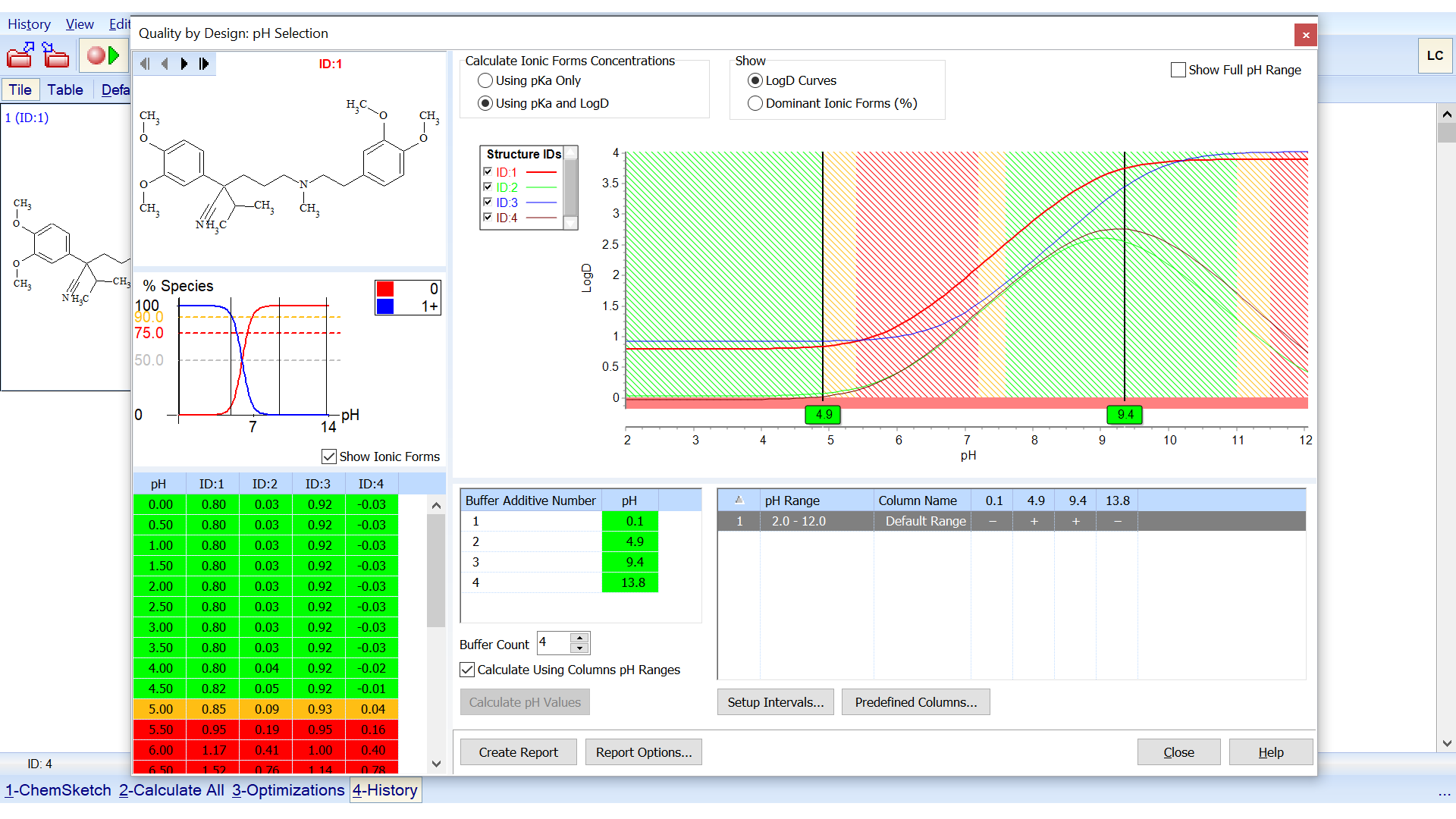 - Graph logD and percent ionization vs. pH to find the best pH for development