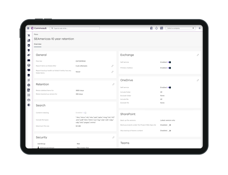 Commvault's Microsoft 365 Backup solution offers seamless protection for Microsoft 365, Dynamics 365, and Azure workloads through a unified interface. It automates data backups, standardizes Service Level Agreements (SLAs) for compliance, and facilitates fast data recovery across the Microsoft Cloud. The solution provides granular recoverability with point-in-time, in-place or out-of-place, item-level, and self-service restore options. It ensures comprehensive protection for Commercial, GCC, and GCC High Microsoft 365 environments. With built-in multi-layered data protection, privacy protocols, and zero-trust access controls, it actively defends data. Additionally, it supports fast and precise searching and preservation of data to aid regulatory compliance.